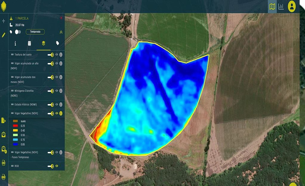 Realizamos el seguimiento de los cultivos en relación a Vigor Vegetativo, Clorofila -Nitrógeno, Estrés Hídrico de tu campo sin moverte de casa / oficina.